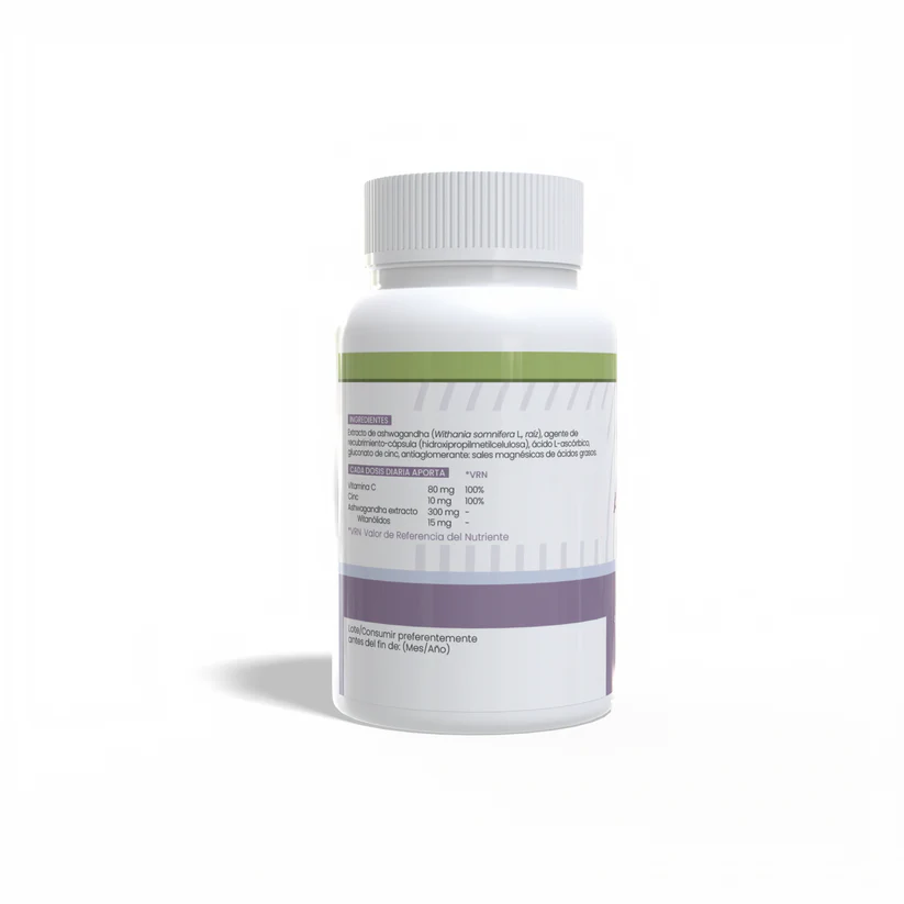 Composition (1 gélule) Vitamine C 80 mg (100% VNR *) Gluconate de zinc 80 mg Zinc 10 mg (100% VNR*) Extrait d’Ashwagandha 300mg Withanolides 15mg *Valeur de référence du nutriment